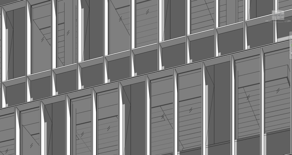 The entire facade of the building was built using custom profiles, to get the maximum out of the curtain wall tool function. The repetitions on the facade reflect a 2/4 ratio and incorporate the obligatory openings for ventilation.