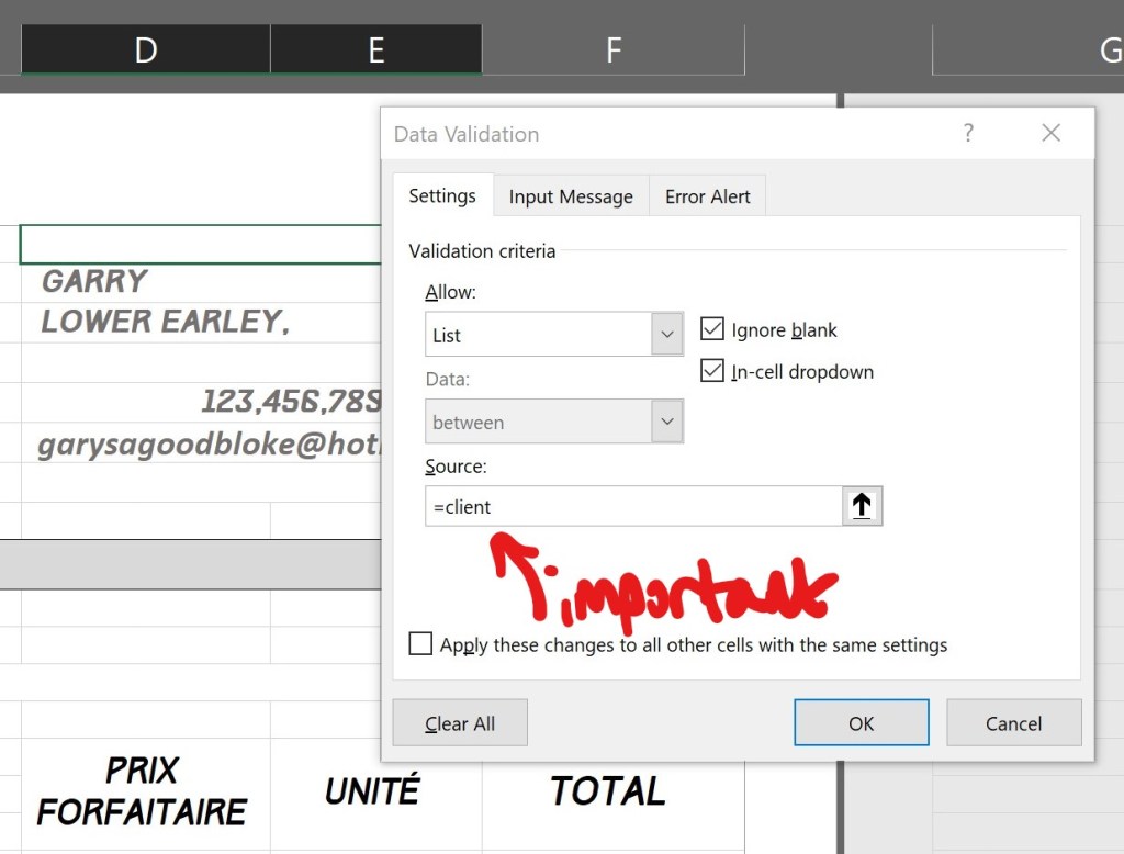 I then drop down the menu to the list function and add “=the name of the cells that you want to list. In my case it was “ID“. This links the list to the ID selected. By using a bit of VLOOKUP magic (look it up) i can now effortlessly create invoices and keep a track of everything!