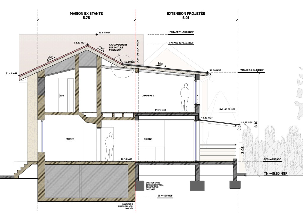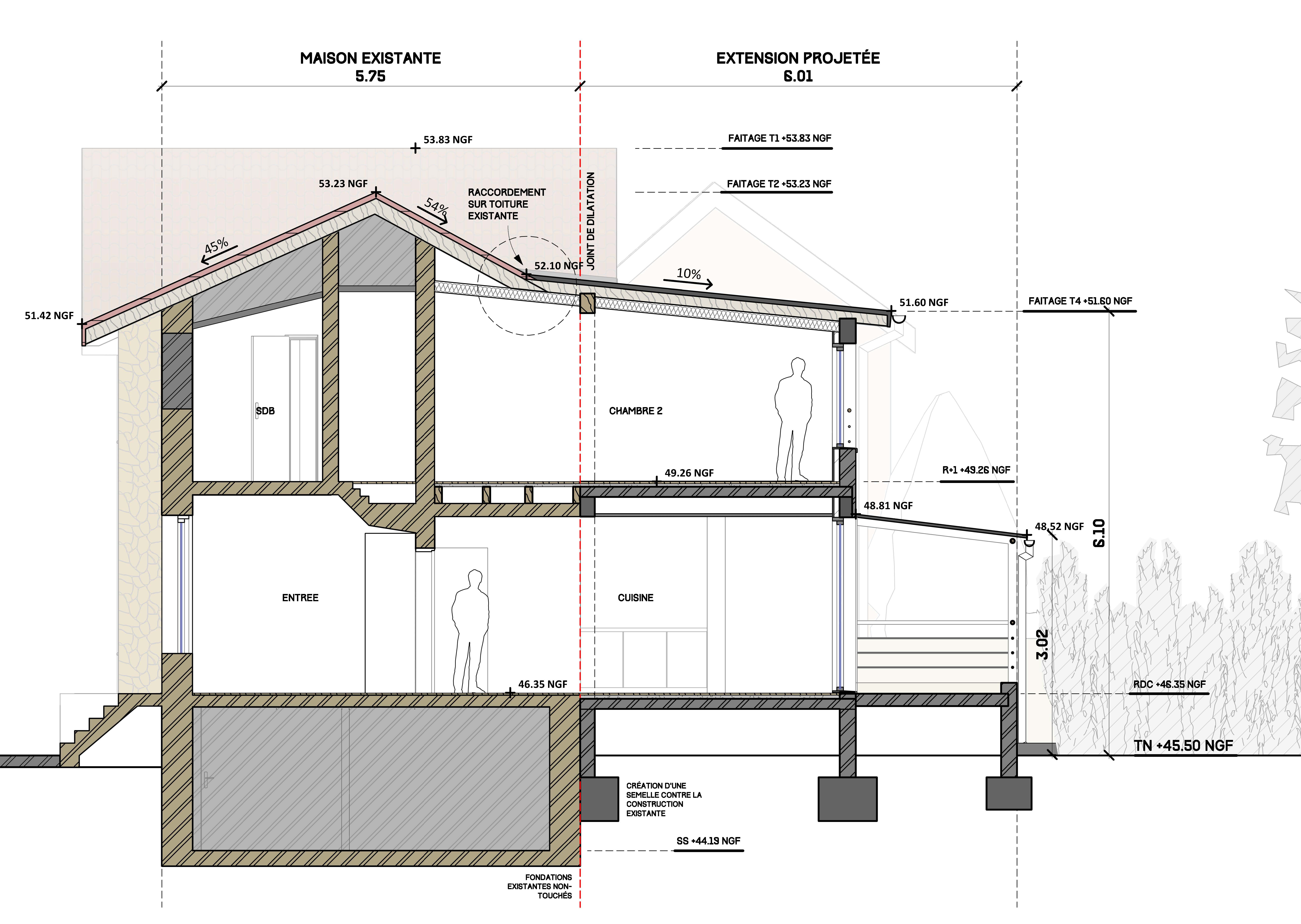Un projet d’extension de maison de petite taille du à la contrainte de la présence de caves souterraines et un chiffrage du projet initial trop élevé pour la construction de fondations profondes et remblais des caves présentes. La solution été de construire en dessous de 10m².