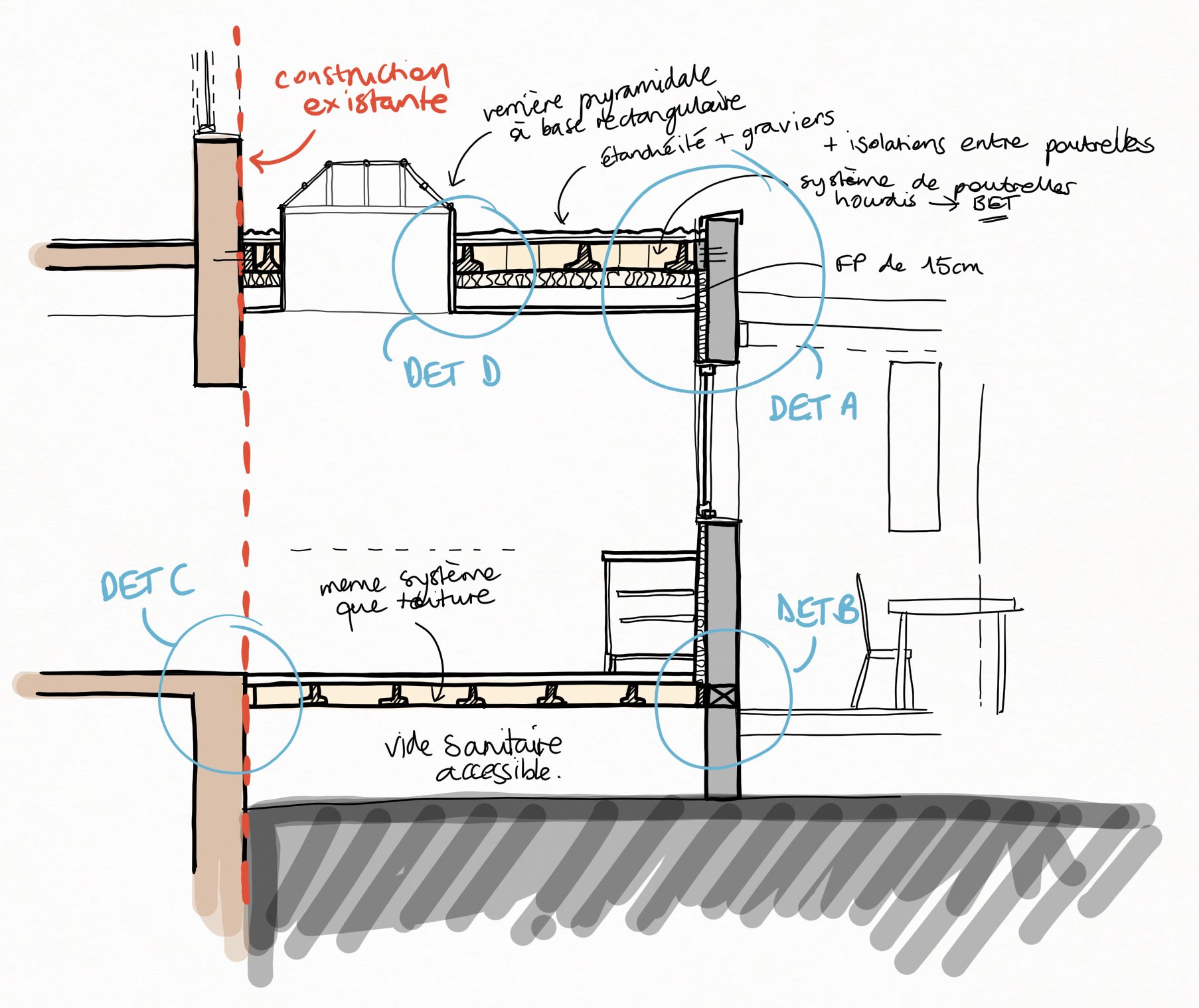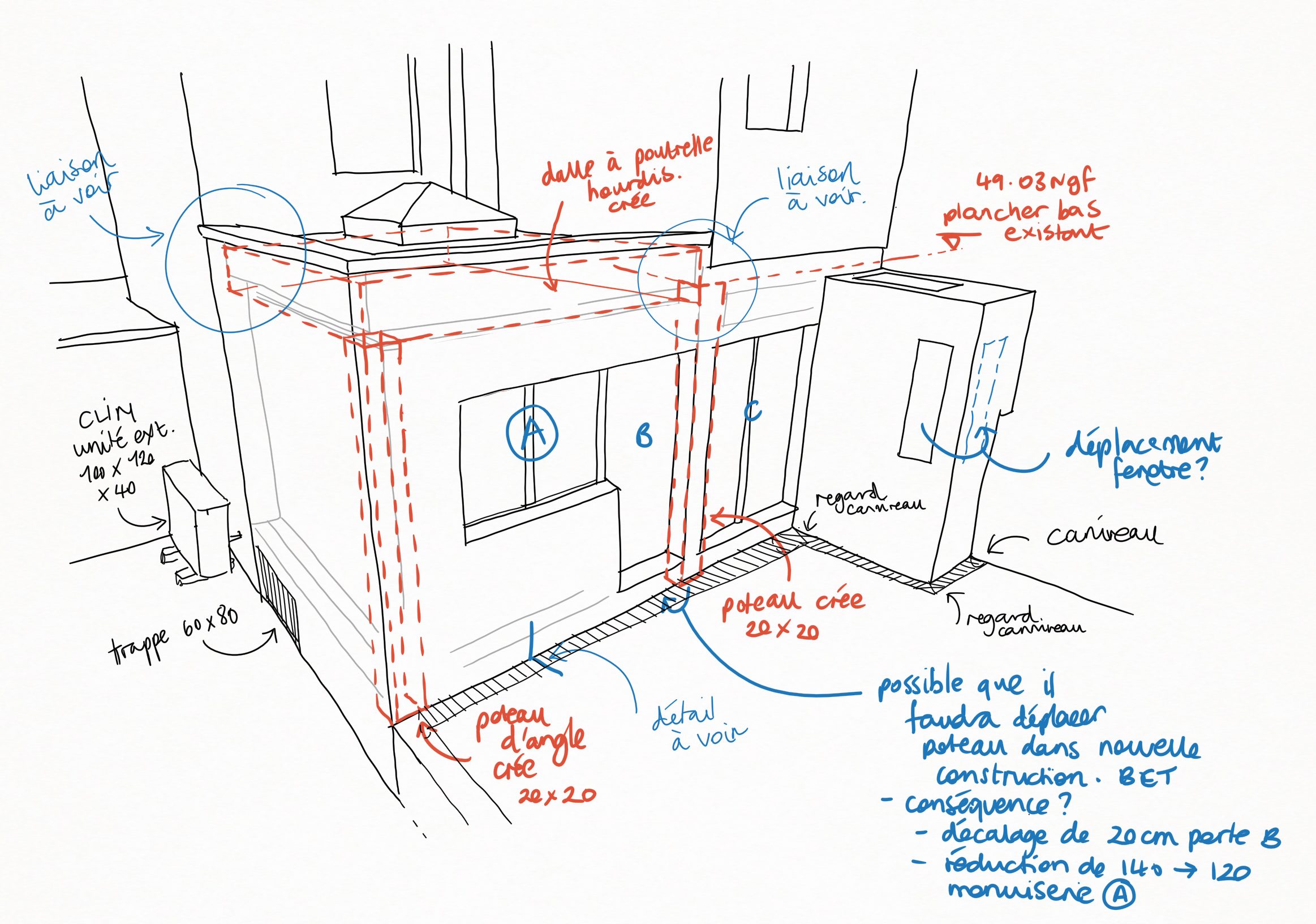 Un projet d’extension de maison de petite taille du à la contrainte de la présence de caves souterraines et un chiffrage du projet initial trop élevé pour la construction de fondations profondes et remblais des caves présentes. La solution été de construire en dessous de 10m².