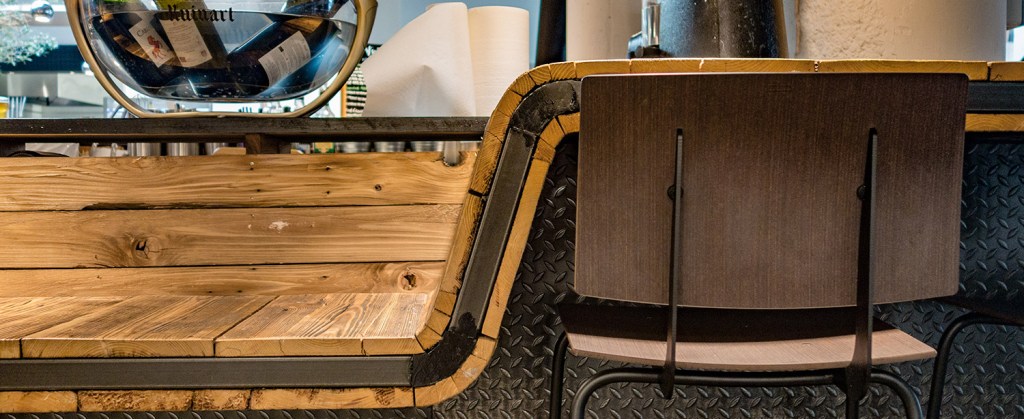 Le gros fil conducteur étant cette tablette bois qui fais le tour du lieu en passant par le sol pour créer des délimitations visuelles et puis ensuite comme bar haut pour ensuite se transformer en table à manger.