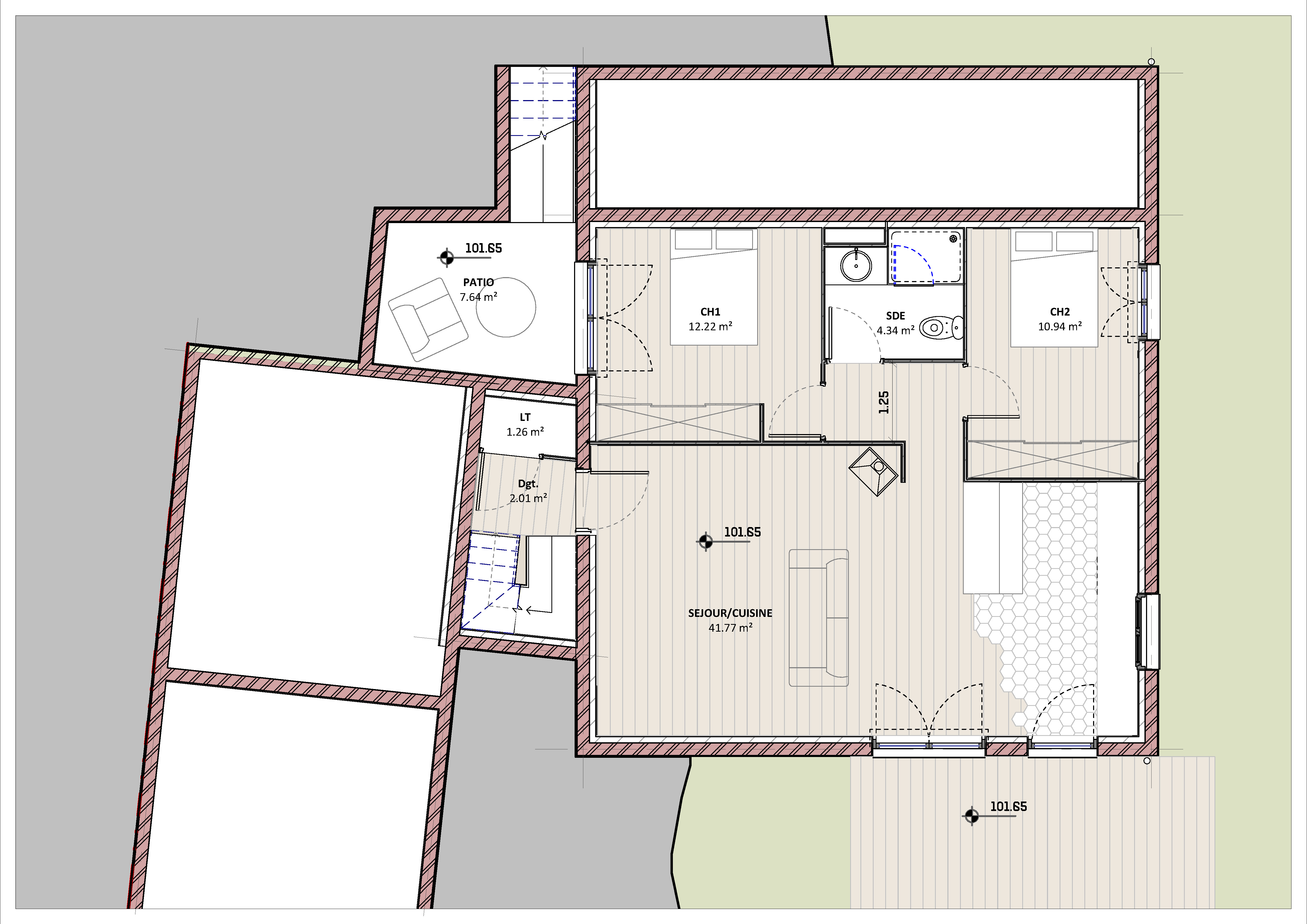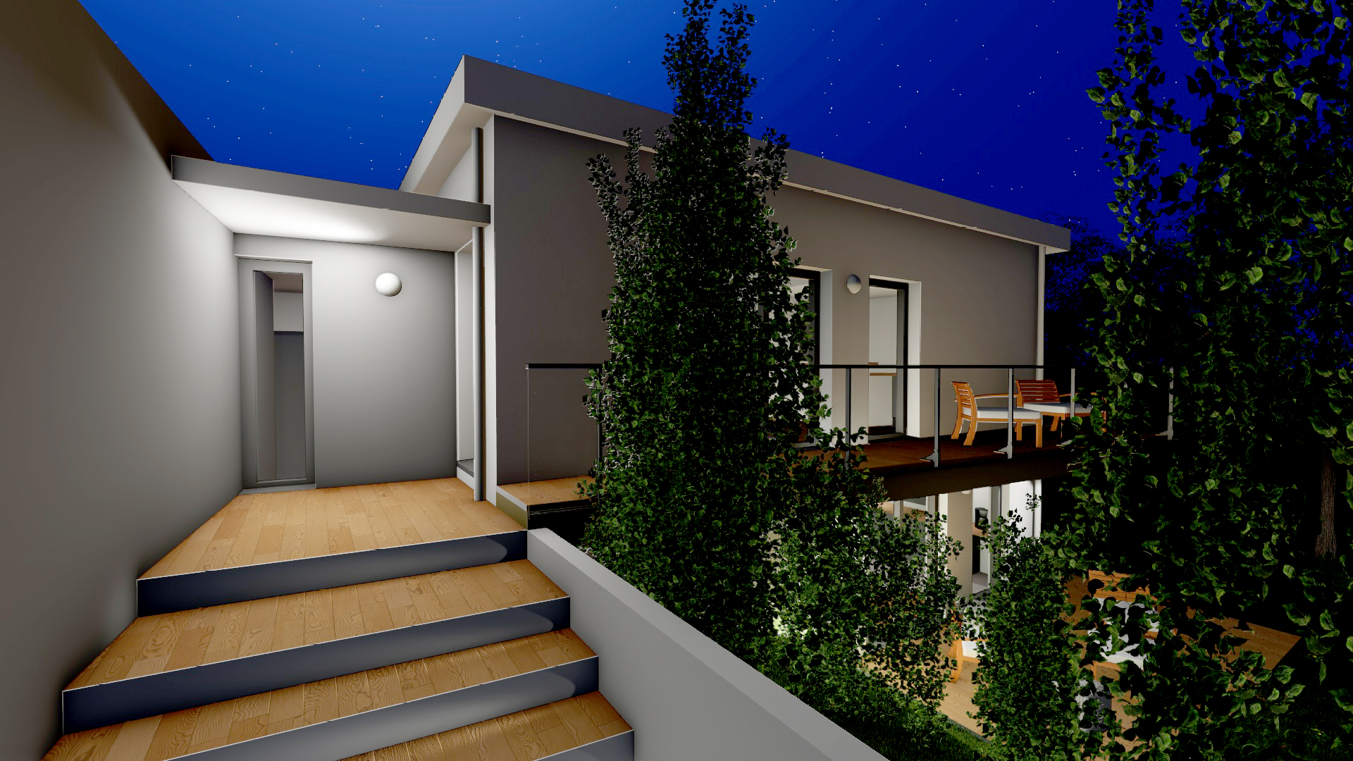 Cette particularité a dessiné le projet et a permis de créer de nombreux interstices ou ce passe pleins de choses intéressantes, notamment la cour anglaise à l’arrière de la maison.