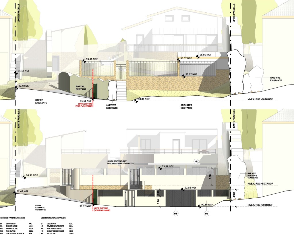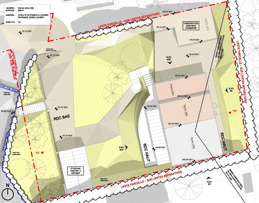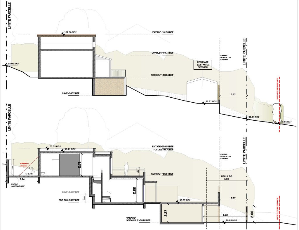 Un projet très intéressant mais d’une grande complexité du à la pente extrême du terrain avec un dénivelé de plus de 15 m de haut en bas. Le projet se dessine sur de nombreux plateaux et profite pleinement de la pente du terrain.