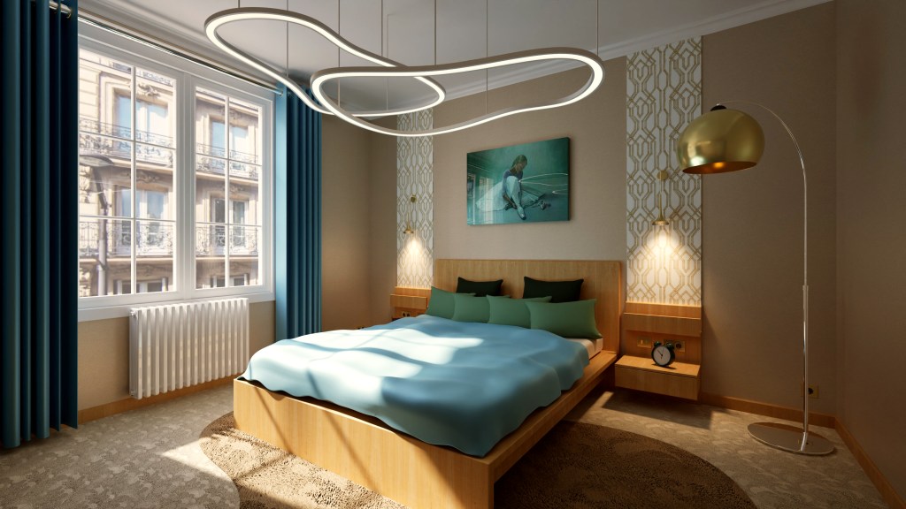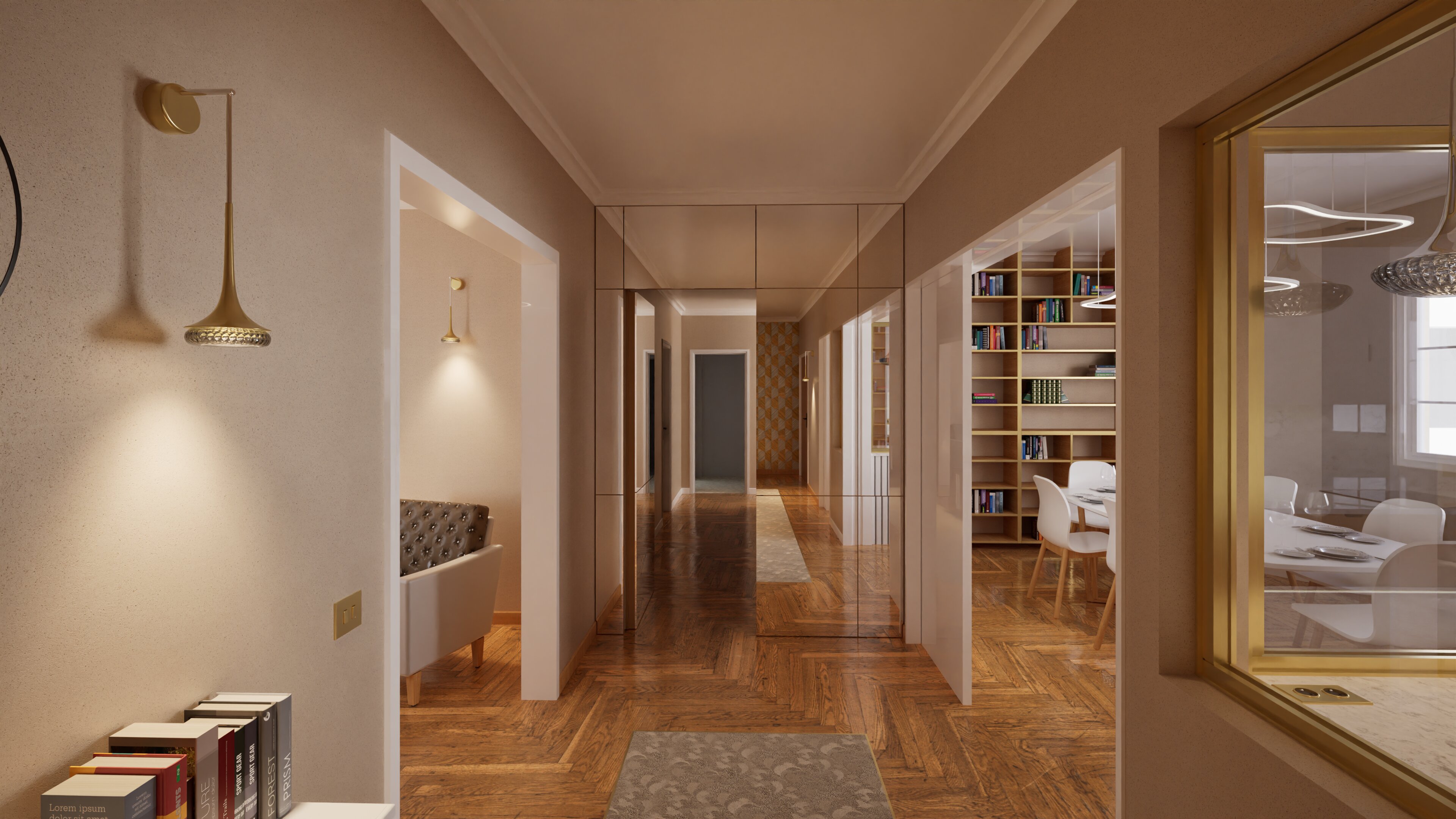 La transition entre les espaces diurnes et nocturnes est assurée par une porte majestueuse sous tenture, entièrement habillée de miroirs. Fermée, elle offre une profondeur visuelle supplémentaire tout en masquant élégamment la partie nuit, conformément au souhait des clients de préserver une séparation discrète entre les deux zones.
