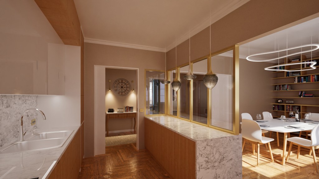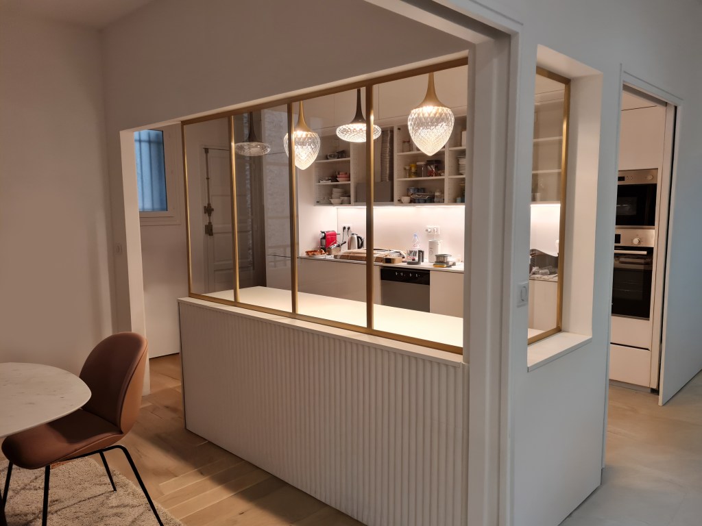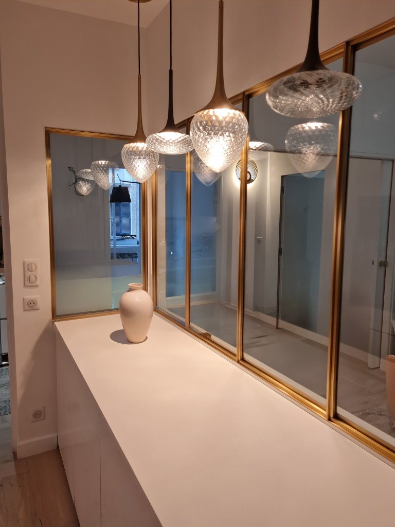 L’organisation spatiale repose sur un axe de circulation central autour duquel s’articulent les pièces de vie, favorisant une fluidité d’usage tout en maintenant une communication directe entre les espaces. La cuisine, ouverte sur la salle à manger via une cloison vitrée en laiton, reste connectée au salon grâce à deux grandes ouvertures encadrant un meuble télé réalisé sur mesure.