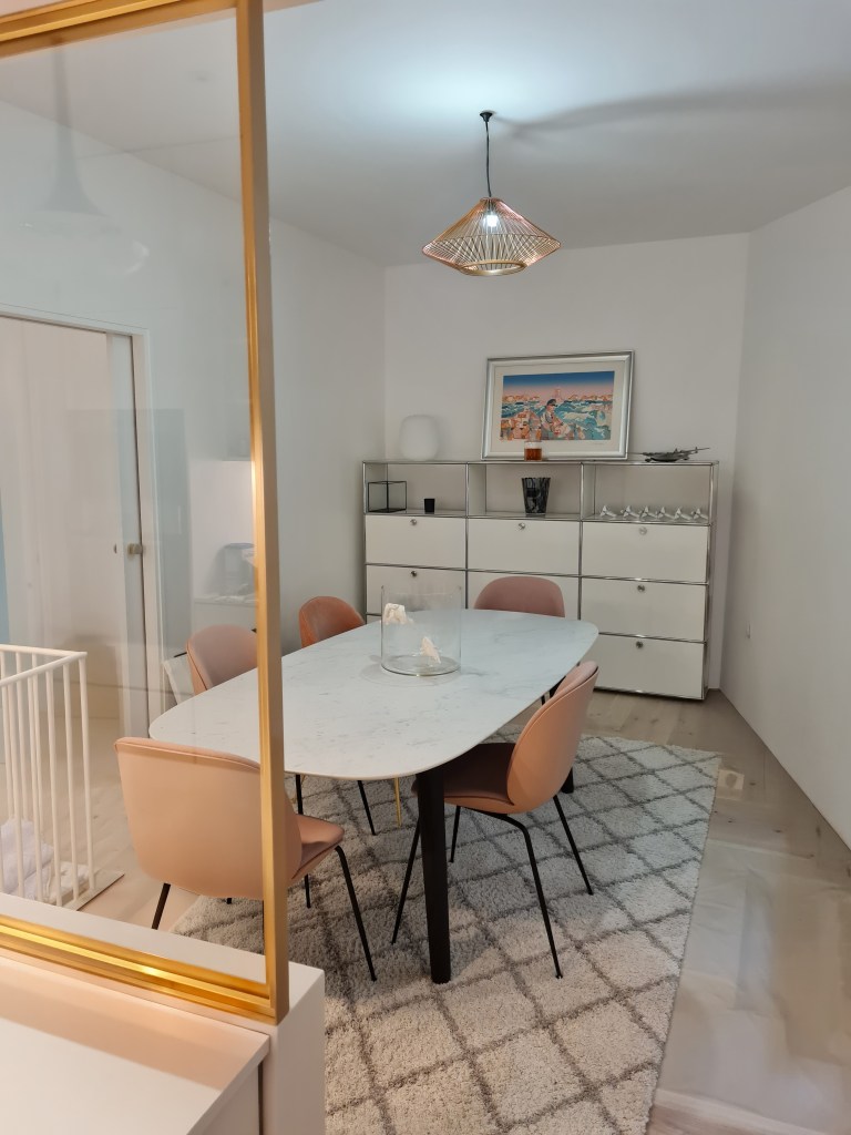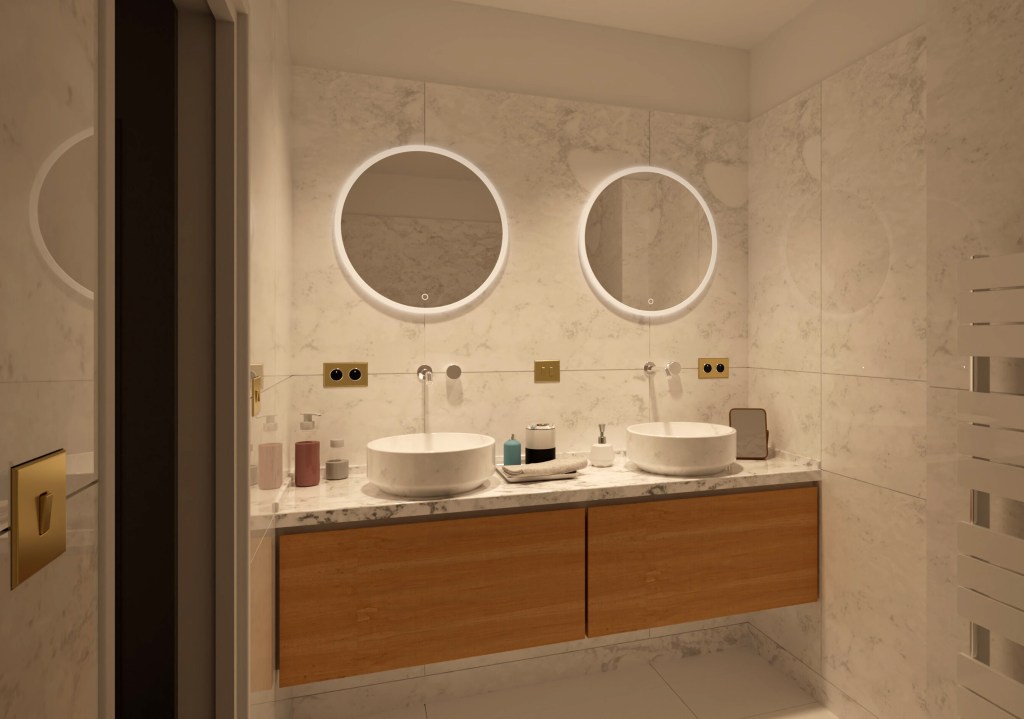 Les salles d’eau ont été conçues dans un esprit de noblesse et de raffinement, avec un carrelage marbré haut de gamme et des équipements de la marque Porcelanosa (meuble vasque, baignoire, douches). L’ambiance générale de l’appartement se veut douce et apaisante, mêlant des tonalités crème et laiton à des accents neutres en blanc, pour créer un cadre chaleureux et intemporel.