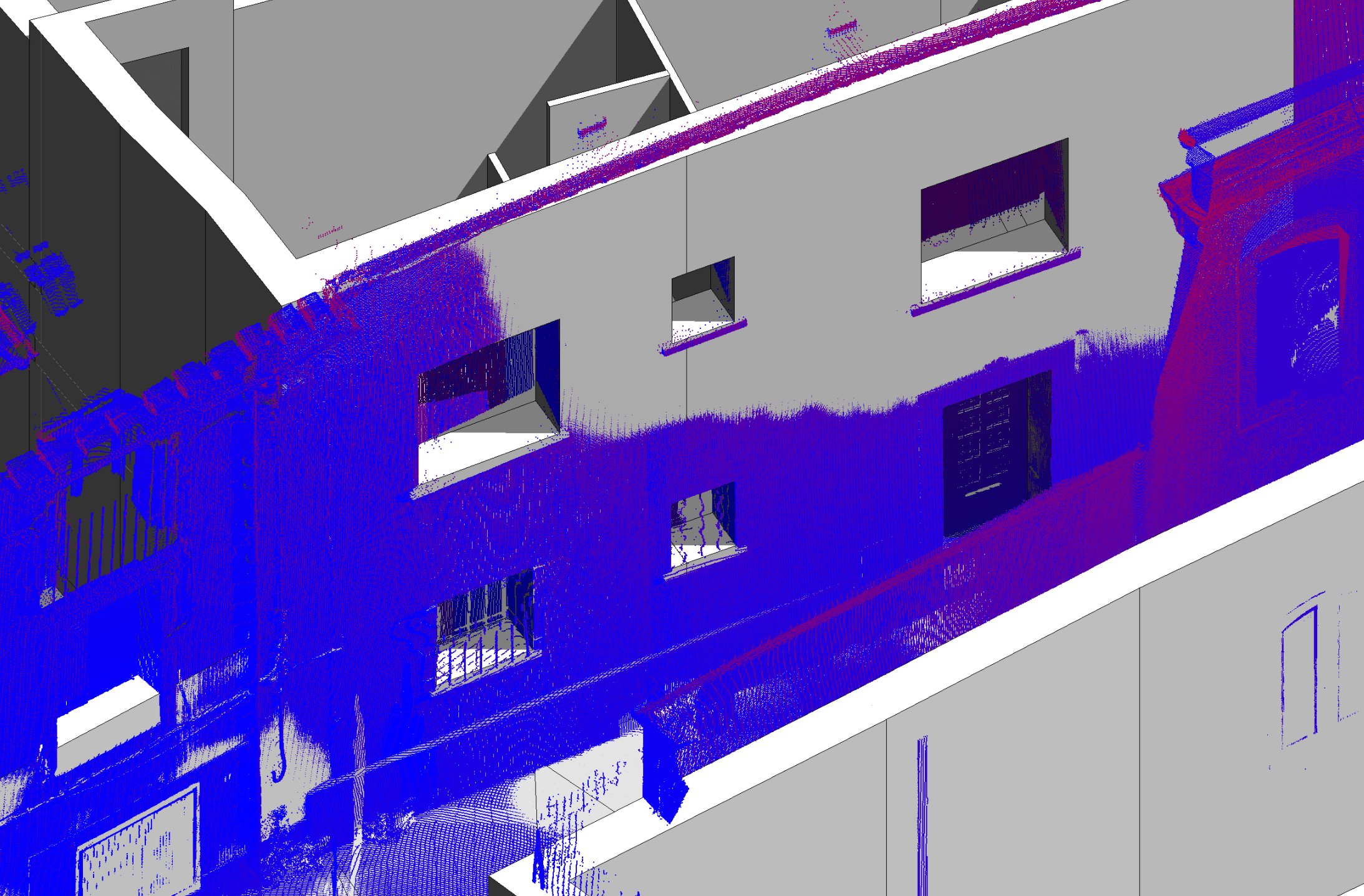 Vu la précision qu’apporte les logiciels liés au BIM nous avons optés de reproduire le bâtiment dans son état avec Revit en se servant du nuage de points créé par le géomètre qui nous à gracieusement envoyé son fichier. Cela à été d’une aide phénoménale dans cette réhabilitation ou tout peut se passer.