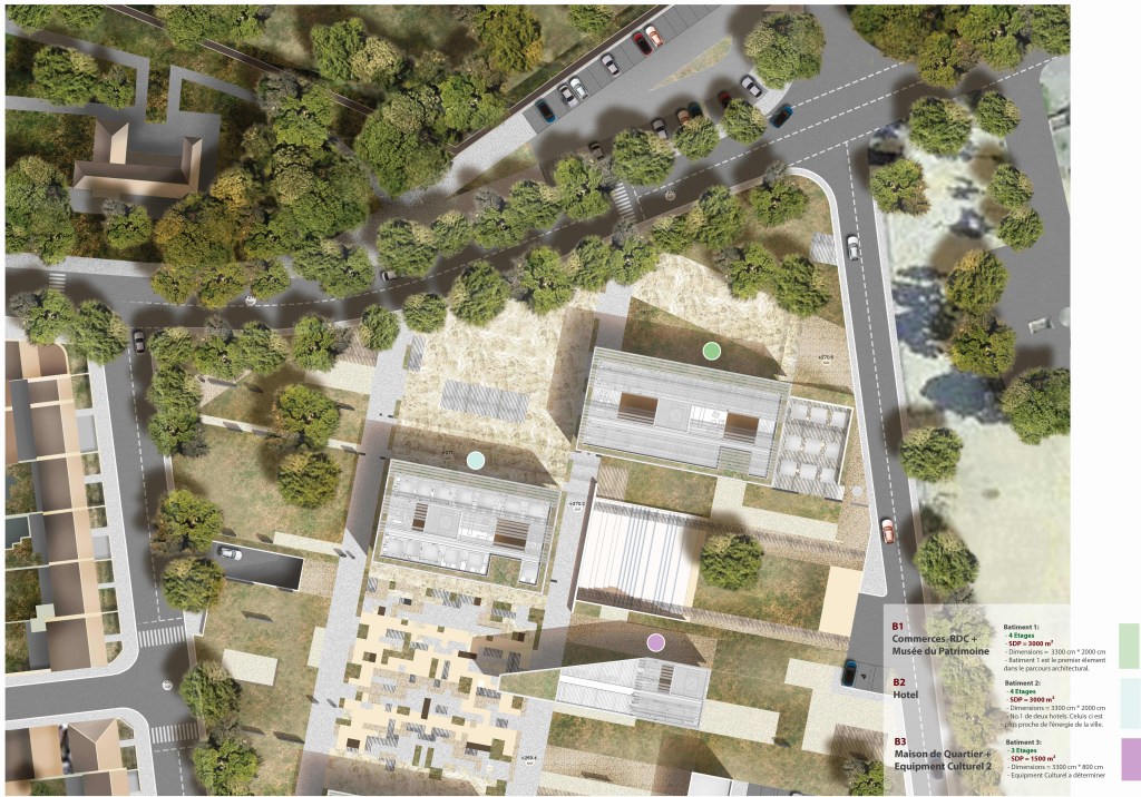 Ce lien est animé par une série d’équipements culturels — cinéma, hôtel, bureaux, centre d’art, amphithéâtre en plein air et logements collectifs — implantés le long d’un parcours minéral ponctué de murs bas qui cadrent les vues et accompagnent le cheminement. L’ensemble crée une séquence spatiale rythmée, propice à la déambulation et à la stimulation sensorielle.