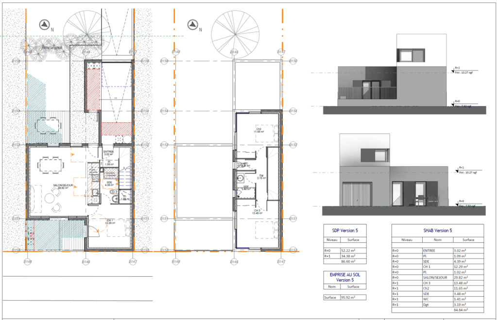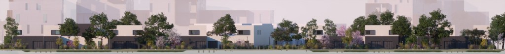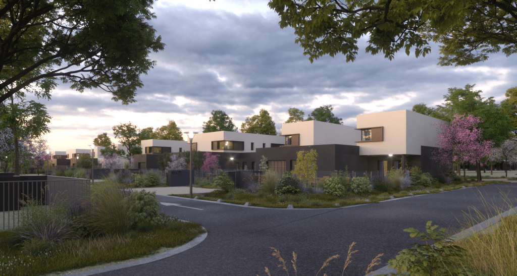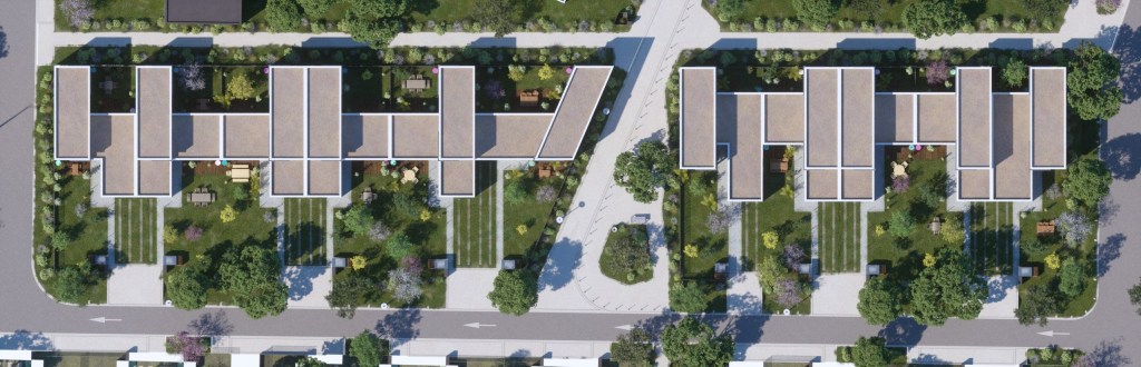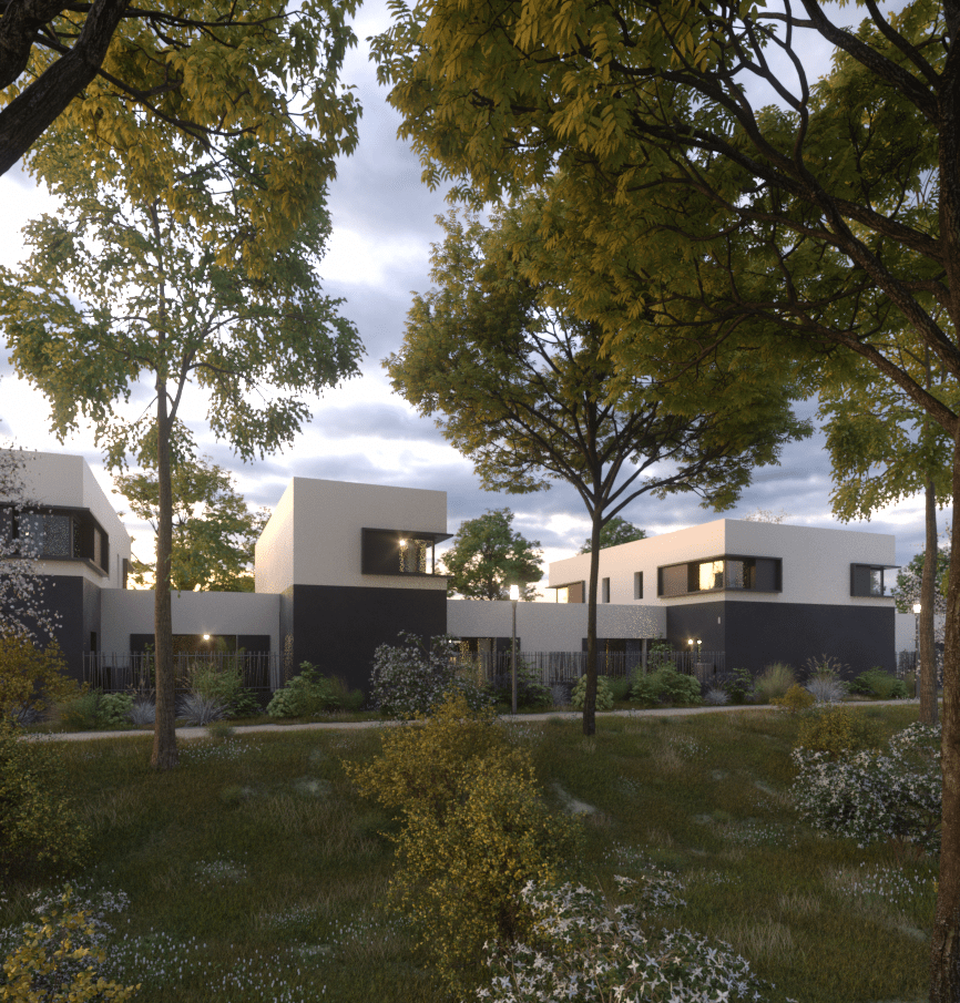 Le point focal des maisons étant une grande menuiserie en angle à l’étage qui donne sur un espace arborée nouvellement crée qui vient sublimer le projet urbain. Chaque maison est également dotée de 2 jardins extérieurs, un a l’avant et un plus petit, à l’arrière.